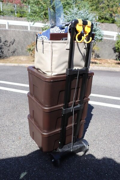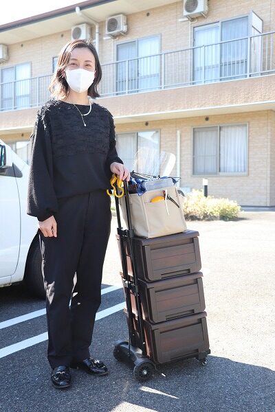仕事へ向かうときは、シザー(はさみ)、カットクロス、カラー・パーマの薬剤、消毒用品などをケースに入れて運びます。ウォータータンクも必要なので、旅行鞄2つ分くらいの大荷物です(笑)