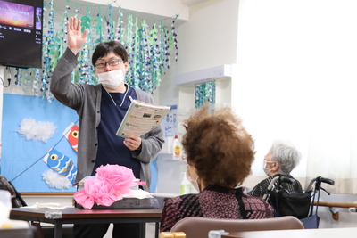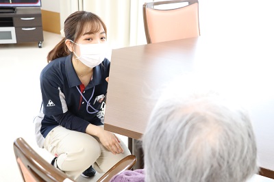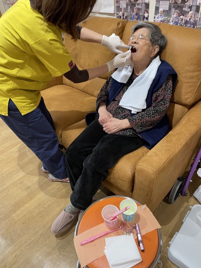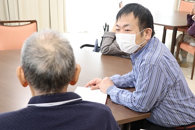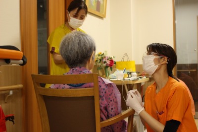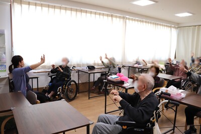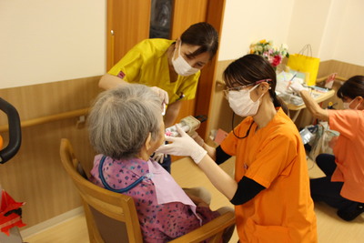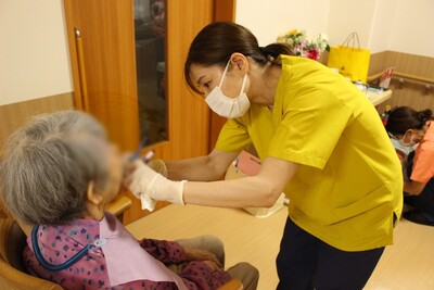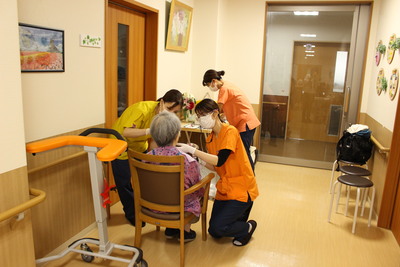 「介護施設様の施設内で施術させていただくため、アロマやお花、ヒーリング音楽を使って利用者様に『まるで美容室みたい!』と思っていただけるような空間の演出を心がけています」[/btp_box]