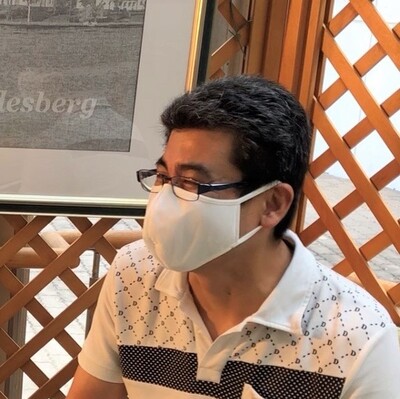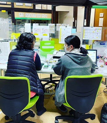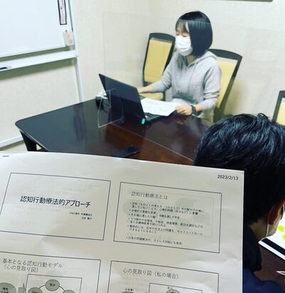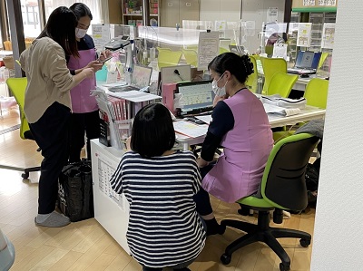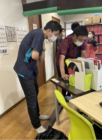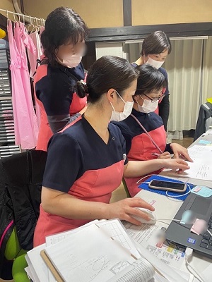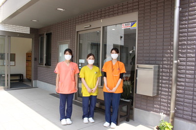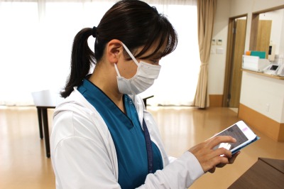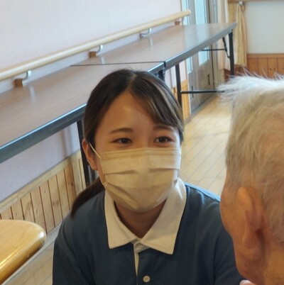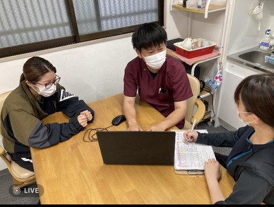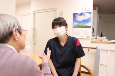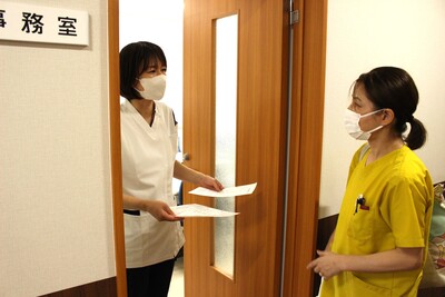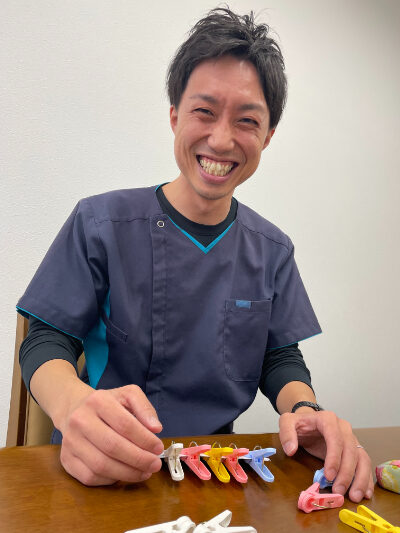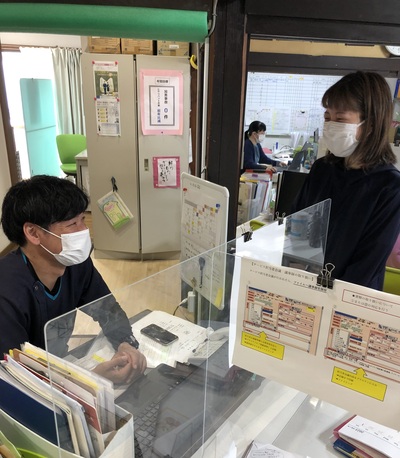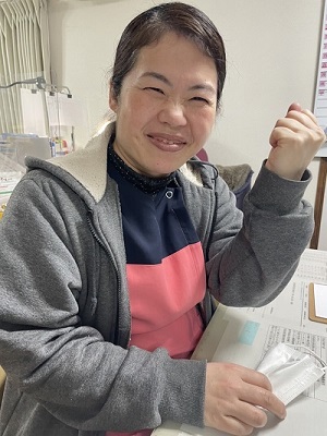 施設によっては、施術中であっても利用者様のマスク着用が必須になることも。途中で外れてしまわないように紐をバッテンにして耳にかけたり(画像)、テープで留めたりという工夫も行っているそうです。