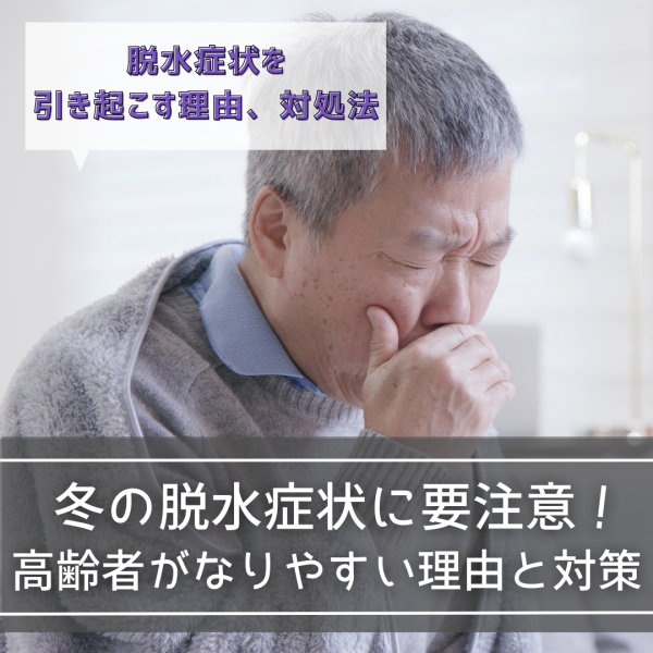 冬の脱水症状は、気付かないうちに起こります。気付いたときには、脱水症状中度や重度になっているかもしれません。利用者さんが脱水症状を起こさないように、こまめな水分補給や室温管理、体温調整をしっかり行ってください。万一脱水症状が見られた場合は、迅速に適切な対応ができるように、フローチャートなどを作っておくと良いでしょう。
